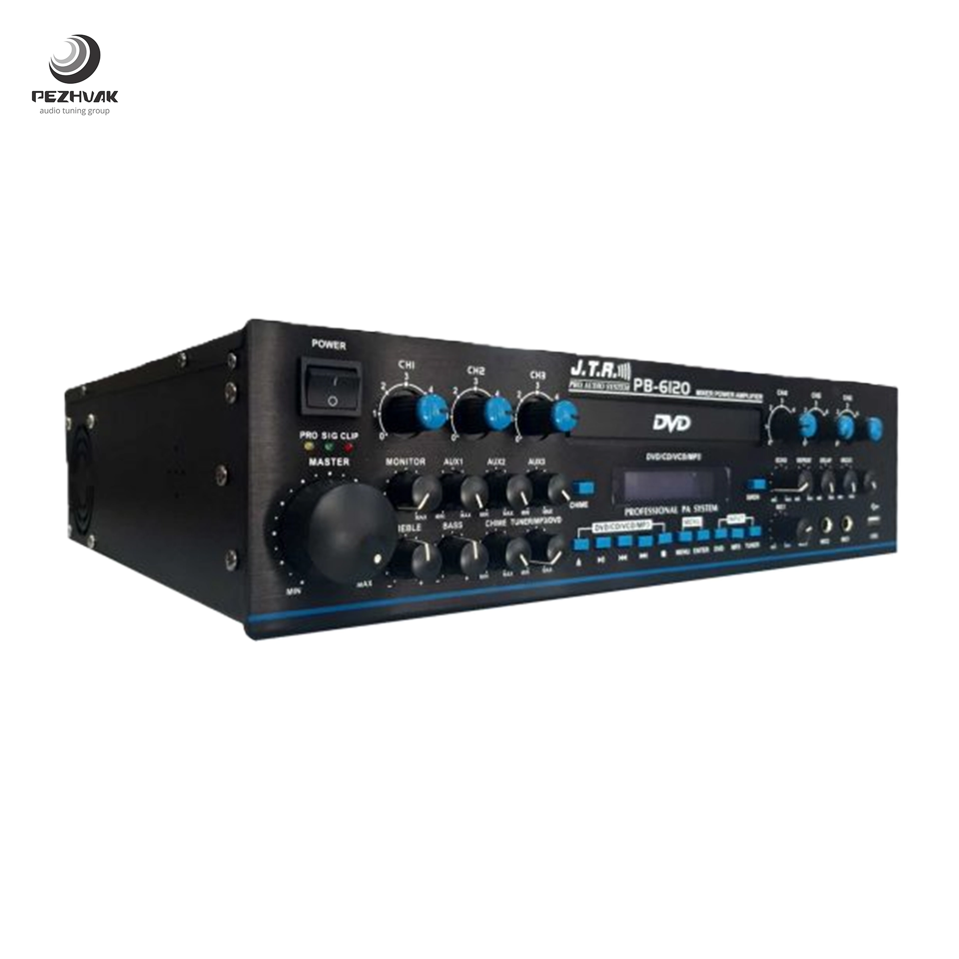 آمپلی فایر اهمی و ولتی JTR PB-6120 دارای افکت اکو دیجیتالی و مدار محافظ داخلی است که ایمنی دستگاه و کیفیت صدای خروجی را تضمین میکند. طراحی رکمونت آن نصب و استفاده در رکهای استاندارد را ساده و منظم میسازد. JTR PB-6120 دارای ۳ ورودی میکروفن و ۲ ورودی کمکی AUX است، که امکان اتصال انواع میکروفن و دستگاههای صوتی جانبی را فراهم میکند.